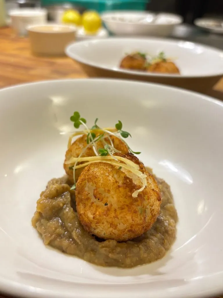 – “Khar Reimagined” — Joha rice arancini served with a khar dip made from raw papaya and black channa.