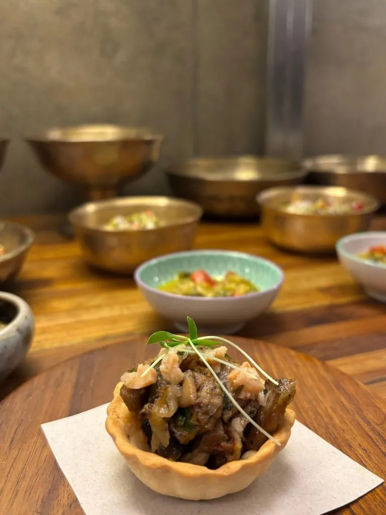 – “Whispers of Smoke” (amuse bouche) — Mini tartlet of smoked pork, fermented bamboo shoot and wild pepper, topped with crisp shallots and a bhoot jolokia dip.