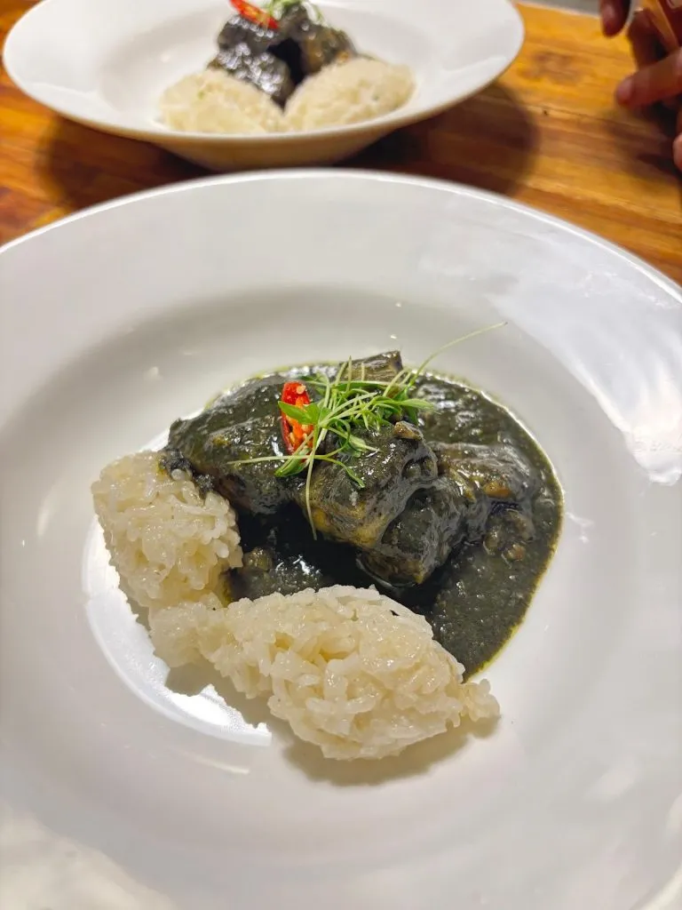 – “Brahmaputra’s Treasure” — Slow-cooked chicken or pork in a roasted black sesame emulsion, served with a quenelle of sticky rice.