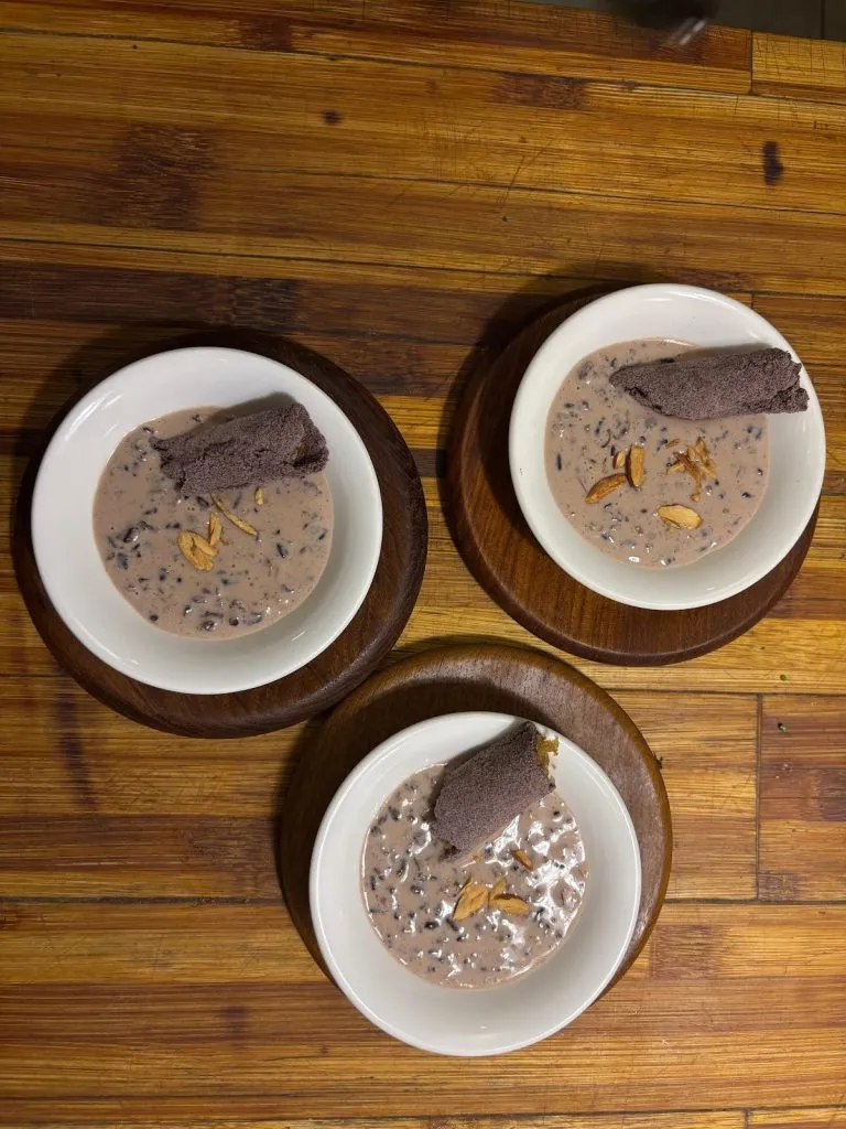 – “Echoes of the Valley” (dessert) — Black sticky rice in coconut milk and jaggery with narikol pitha and komolar piyox.