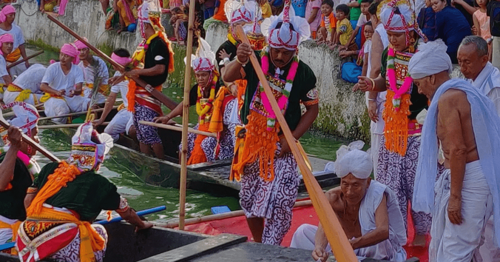 After the divine procession, the mood shifts from solemnity to excitement. The time for Hiyang Tannaba, the sacred boat race, has arrived. Two boats, painted in vibrant red and yellow, are brought to the starting point. Their serpent-headed prows gleam in the sunlight; the rowers, clad in Ningkham, Shamjin, and brightly coloured Kokyet headgear, stand ready.