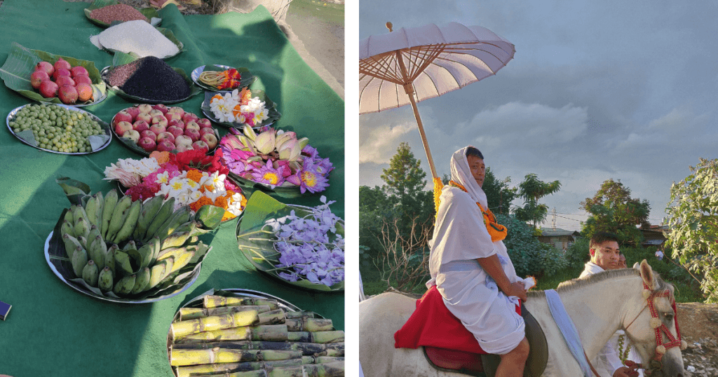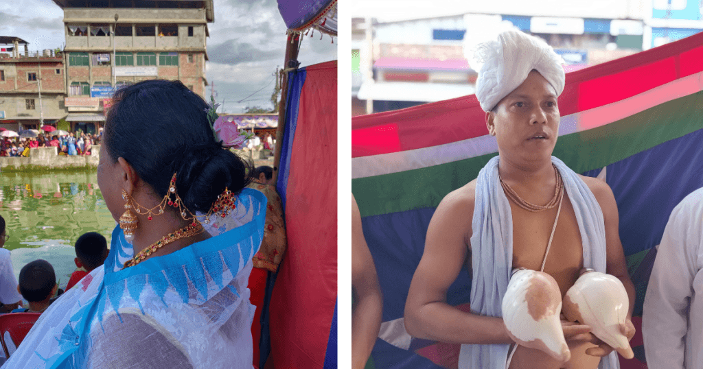 Before sunrise, the two Tengmai Leppas — leaders of the competing teams — arrive at the temple of Shri Bijoy Govinda. Dressed in white robes, they carry gold and silver offerings in small vessels. Their steps are solemn, their faces calm, as they bow before the deity. The offering symbolizes the surrender of human pride to divine will, a ritual act affirming that no man rows alone; every stroke is guided by the grace of the divine.
