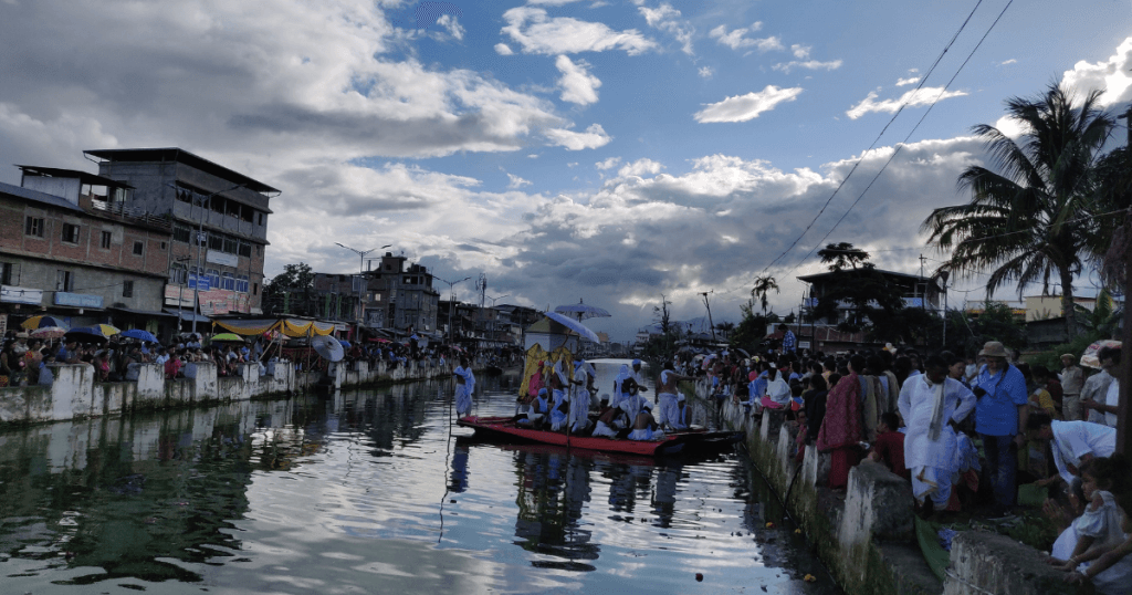 It is early morning in Langban, the golden month of harvest in Manipur. The sky above Sagolband is streaked in soft hues of pink and silver, and the air carries a certain stillness, a gentle pause before something deeply sacred begins. Along the moat of Bijoy Govinda, the heart of Imphal begins to awaken. Women in traditional phanek gather with plates of flowers, fruits, and lamps; the scent of burning incense curls upward, mingling with the crisp autumn air. Somewhere in the distance, a conch shell sounds long, deep, and resonant calling devotees to the banks of the sacred water.