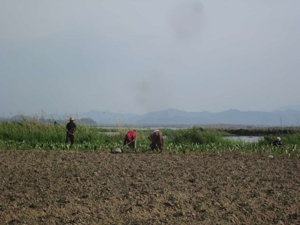 Women working on their fields near Loktak lake, Manipur. This small plantation is growing Yam.