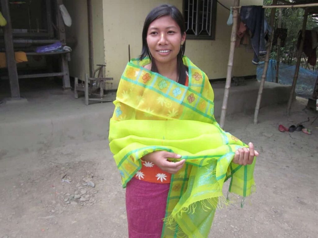 A weaver in Bishnapur shows off her latest edition off the loom. A thin gauze like tissue silk stole with little motifs known as Rani fi and worn by the women of the Meitei community. They give the ready pieces to the vendors in Ima Market to sell for them.