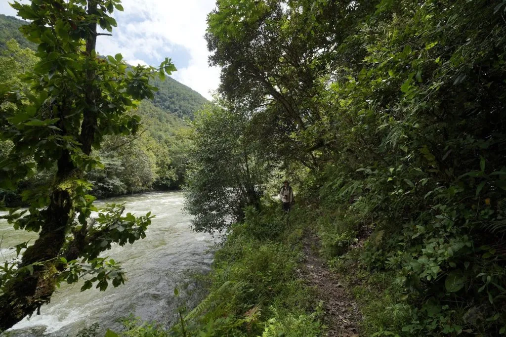 The path split, one route veering right towards a place called Dating, but a washed-out bridge made that choice for me. I would follow the Tsomkha Zemen, staying true to its course.From this point, the trek grew more intimate. The path narrowed, drawing me deeper into a wooden terrain where the air cooled and the sounds of the village faded, replaced by the rustle of leaves and the chatter of unseen birds. I walked among wild walnut and pear trees, their gnarled branches reaching out like old friends. The trail was a gentle conversation of small ups and downs, a rhythm that my body settled into with ease.